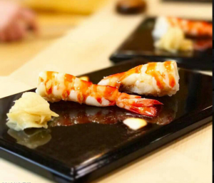 だから高級な寿司は、一口で食べられる大きさにまで小さく、ネタはシャリからほんの少しはみ出るほどになりました。下の写真では、ネタが大きいのでネタを半分に切って、寿司を小さくする工夫がしてあります。職人さんは、海老とお米を美味しく食べる工夫をしているのではないかと思います。