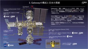 上の写真で、中央の下側で4枚の電池パネルを放射状に持っているのがゲートウェイにドッキングしている地球と月の間の乗り物のアルテミスです。ゲートウェイ本体を隔てて上側に在るのが月着陸船HLSです。ゲートウェイは現在も活動中の国際宇宙ステーションISSを月の軌道に創るようなことであり、将来は火星への発進やその他の宇宙活動のベース基地となるのでしょう